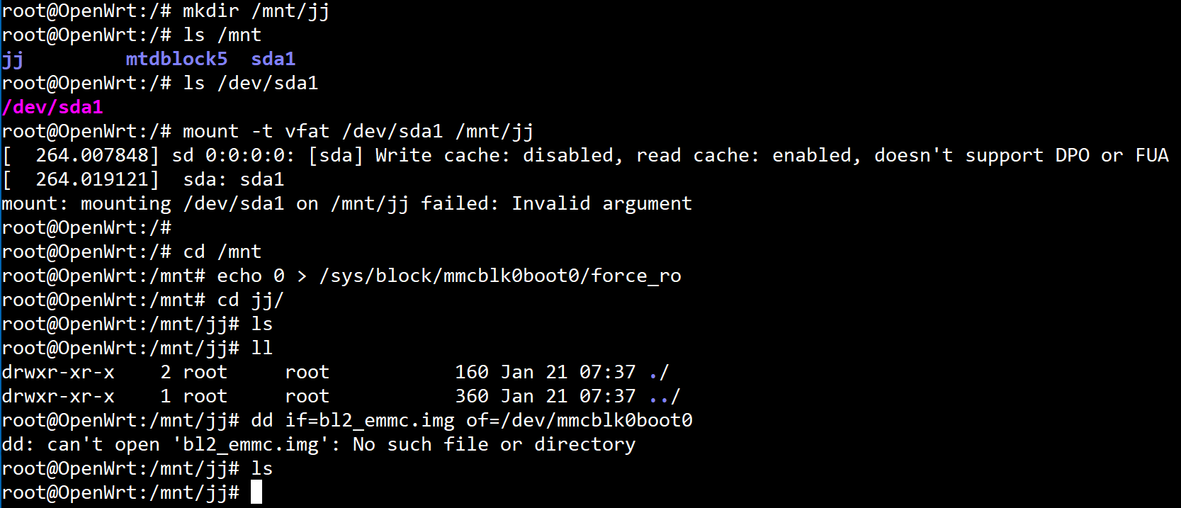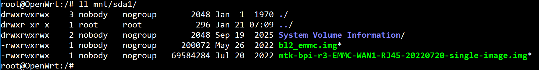 This is the NAND boot with eMMC recognized. Both bl2_emmc.img and mtk-bpi-r3-EMMC-WAN1-RJ45-20220720-single-image.img are ready in the inserted USB device. By following the official instruction, I got a mount related error.