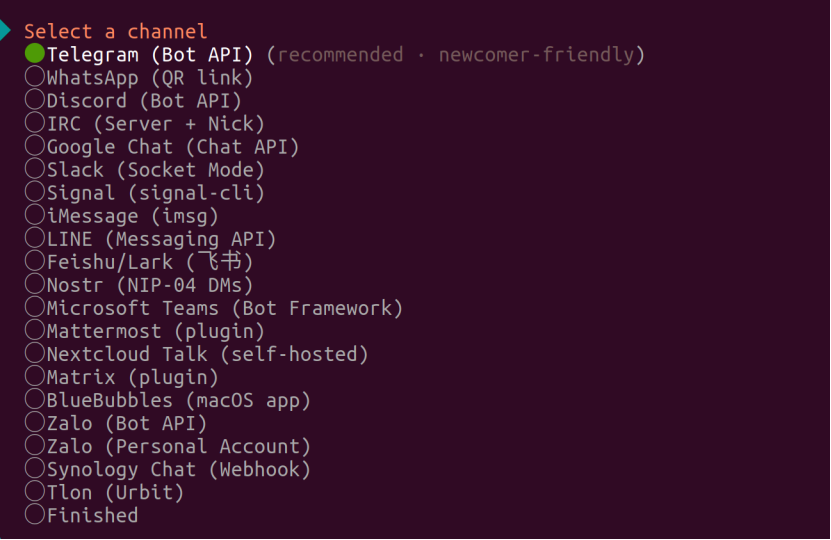After configuring the large model, you will return to the main menu interface. You can configure settings such as skills and channels according to your own usage scenarios. Openclaw has 50 built-in skills. The configured skills can be viewed in the skills option in the left sidebar of the Openclaw UI interface. Regarding channels, interaction with Openclaw is achieved through communication apps. The supported channels are as follows: