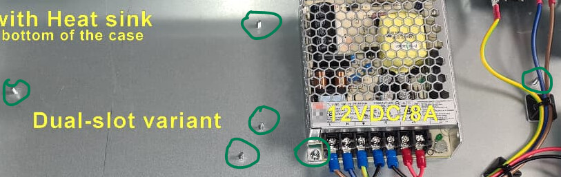 A 12 VDC power supply is available from various electronics stores. Threaded bolts (circled in green) are provided in the housing for attaching power supplies and fans. I designed and implemented the cable assembly, including the necessary crimp connections, myself. The two 230 VAC~ power plug connections are located on the left and right rear panels.