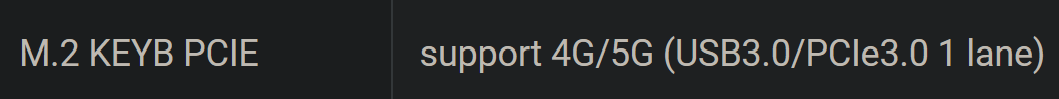 In the main specs it says “M.2 KEY-B slot with USB3.0 for 4G/5G Module” but then in the diagram below it says “M.2 KEYB FOR 4G/5G (USB3.0/PCIe3.0 1lane)”.