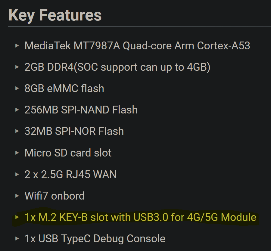 i would miss the key-m slot…also noticed this on R4Lite which uses same SoC. Imho more users want to use nvme than a modem. Basicly both could be supported with key-e slot, but afair modems need slight higer voltage which may cause heat or damage to some nvme drives. Also a router-board with only 2 RJ45 ports (same for R3Mini) and also without wifi is a strange router