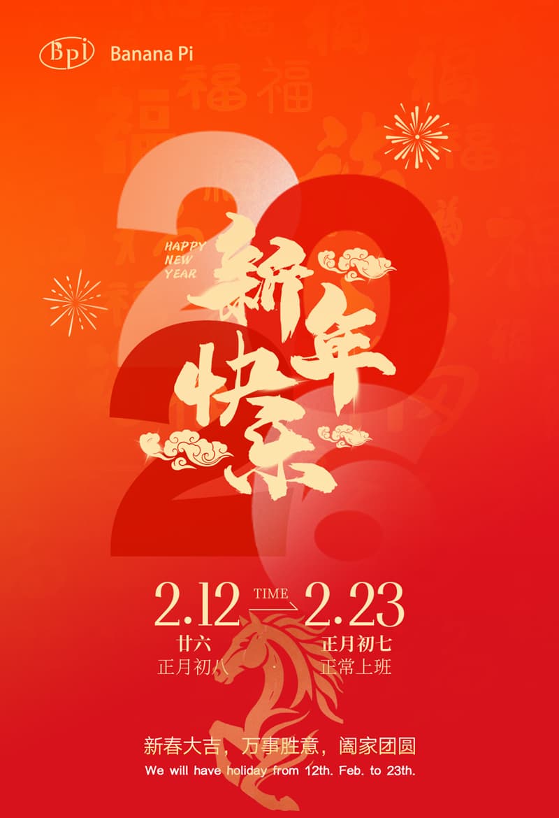 The Chinese traditional Spring Festival is coming. Banana Pi team will have holiday from 12th ,Feb to 23th, Feb, 2026, we will back to work on 24th, Feb. Kindly note that your emails can be received normally, but will be handled after we back to work. If urgent, please call the related staff.