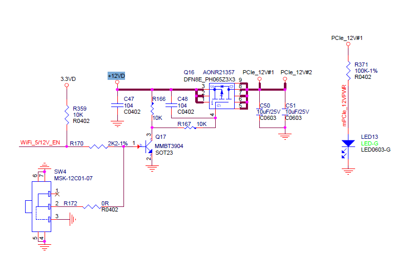 Then, the power supply for the mPICe is switched on via SW4, but it doesn’t turn on the converter, only the MOSFET, and the 20V goes directly to PCIe_12V#1 and PCIe_12V#2. So I’m right in saying that the WiFi card is receiving almost the full voltage from the power supply. Of course, you have to subtract the voltage drops on the diode and MOSFET, but the total is less than 0.5V. So my question is, is this supposed to be the case? Does the BE14 card accept this voltage? I have a damaged WiFi module and I don’t know the cause, and the seller hasn’t contacted me since we both figured out it was faulty" SinoVoip Co.,Limited Banana Pi Store".