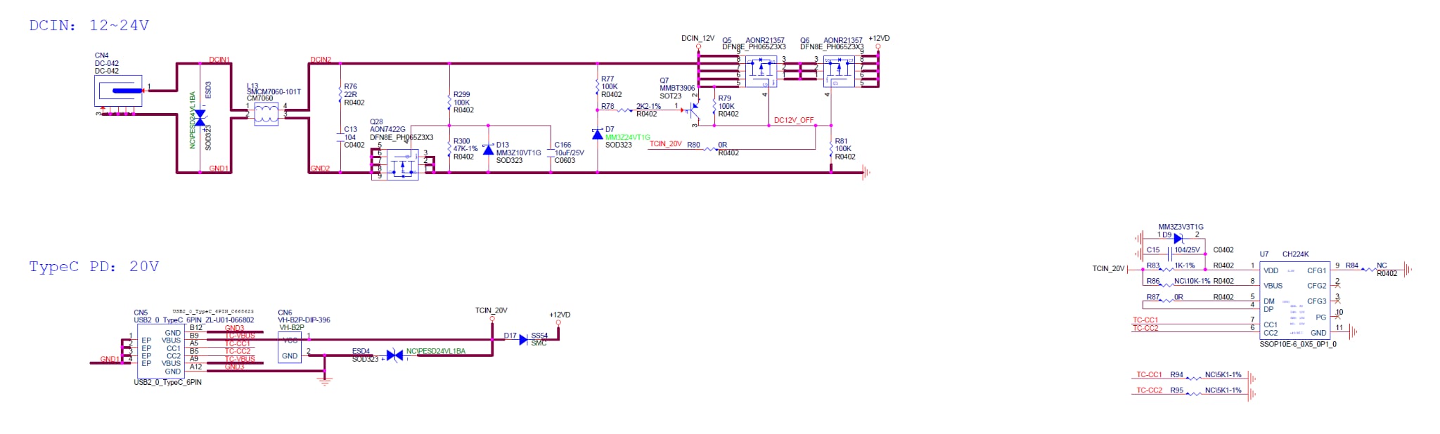 i also wonder about the ch224k section…there is TCIN_20V, but seems no output, TC-CC1/2 seems to be the pins from usb-c socket (configuration pins for selecting usb-voltage?), based on other schematics with this chip output should be pin8 (VBUS) and should be 5V which is connected over an 10K resistor or not connected (not clear in Schematic) to TC20V