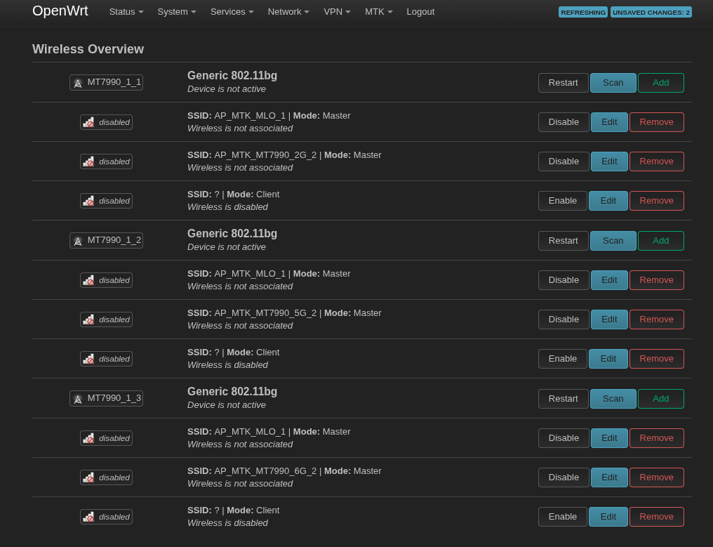 - OpenWRT MTK MP3.1 wifi SDK or MT76 wifi driver for BE14000 Wifi Card