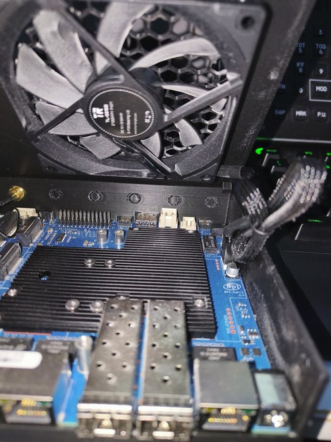 The fan blows directly onto the CPU heatsink and much of the SFP+ cage, leaving (intentionally) more space around the SFP+ cage for airflow to exit around the port, attempting to dissipate the heat from the SFP module.
