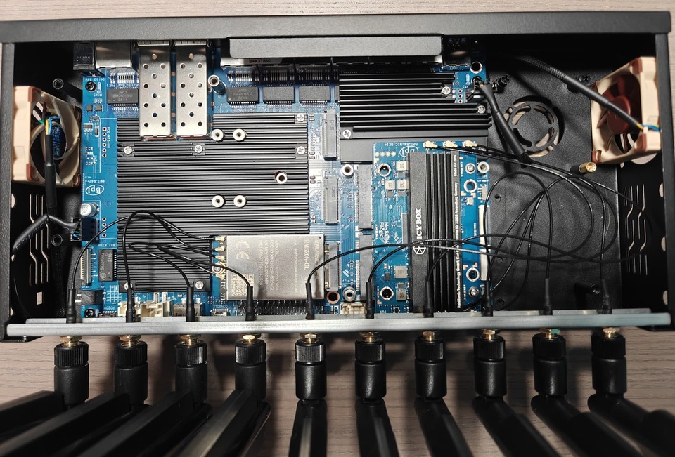 Since I mounted both the BE14000 and the RM-520N-GL LTE modem, I decided to mount all the antennas to the front and in order to minimize pigtails connections: the 4 for LTEs then the 3+3 for wifi are kind of a big array. We’ll have to see how that goes for SNR performance.