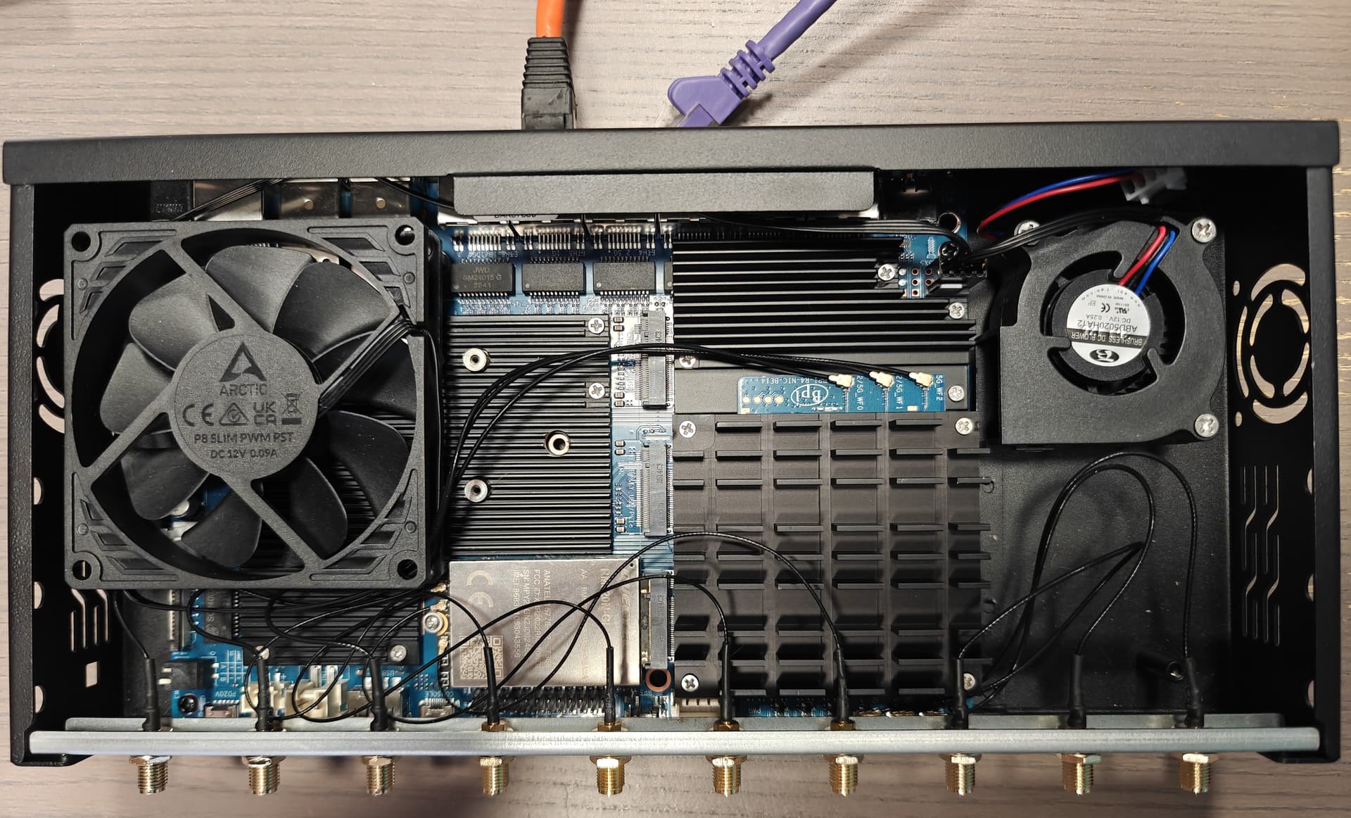 The fan blows directly onto the CPU heatsink and much of the SFP+ cage, leaving (intentionally) more space around the SFP+ cage for airflow to exit around the port, attempting to dissipate the heat from the SFP module.