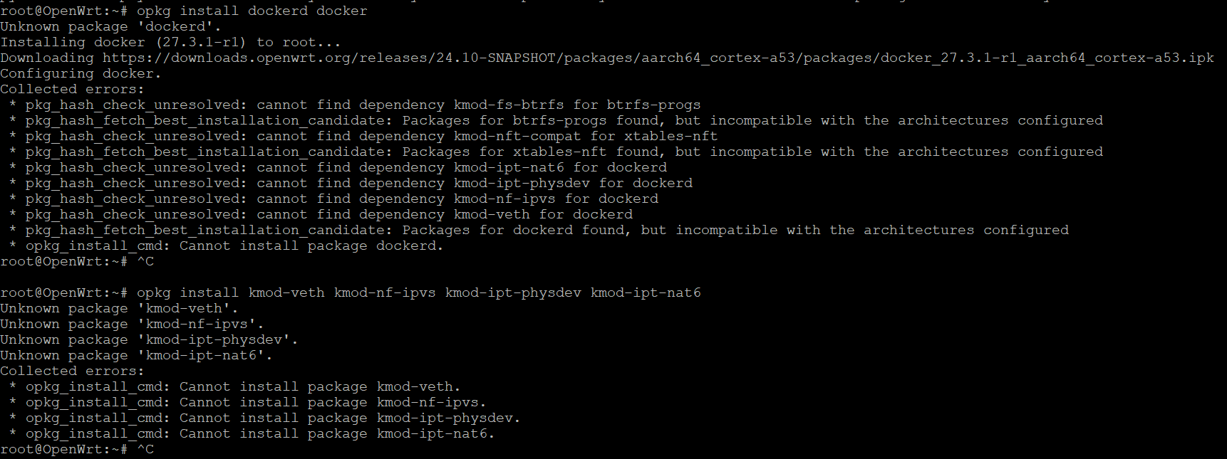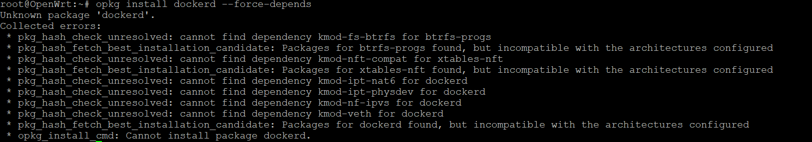 When attempting to install dockerd, the following kernel module dependencies are missing: 尝试安装 dockerd 时,缺少以下内核模块依赖: kmod-veth (Virtual Ethernet) kmod-nf-ipvs (IP Virtual Server) kmod-ipt-physdev (Physical device match) kmod-ipt-nat6 (IPv6 NAT) Architecture incompatibility errors / 架构不兼容错误:
