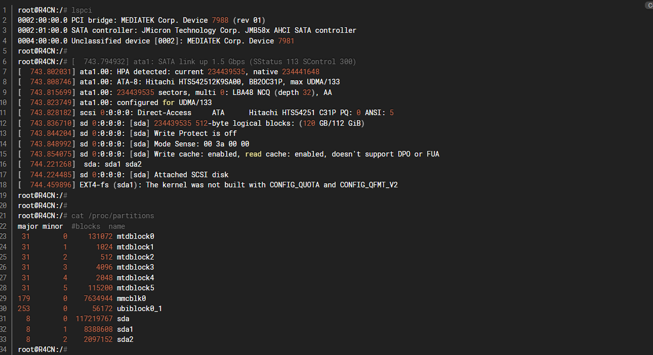 lspci is used to list the PCI devices in the system, while cat /proc/partitions can display disk partition information