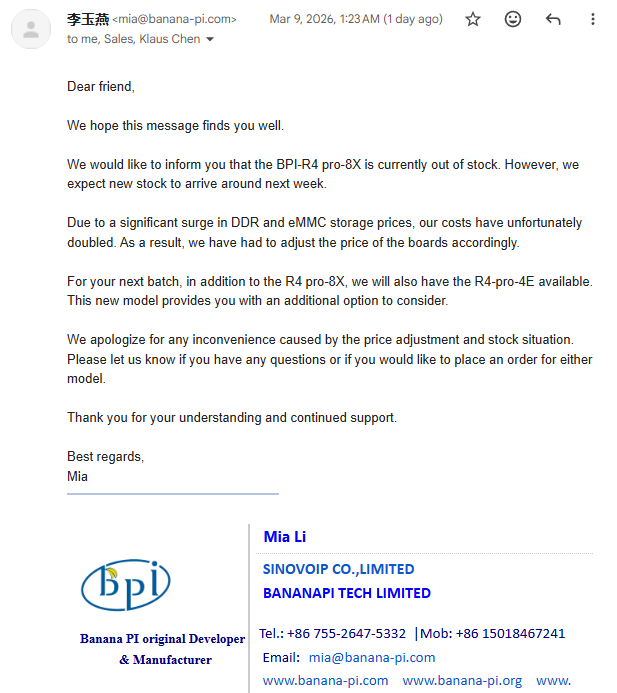 Sadly, straight from the horse’s mouth, we are looking at a massive price hike on new batches of Banana Pi products. I reached out to the BPI Shop, and they confirmed my worst fears: significant price increases are coming for any new inventory.